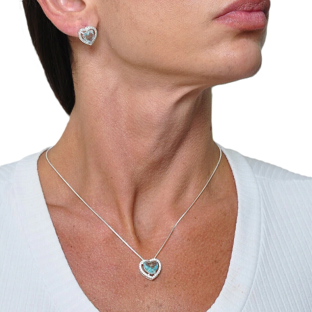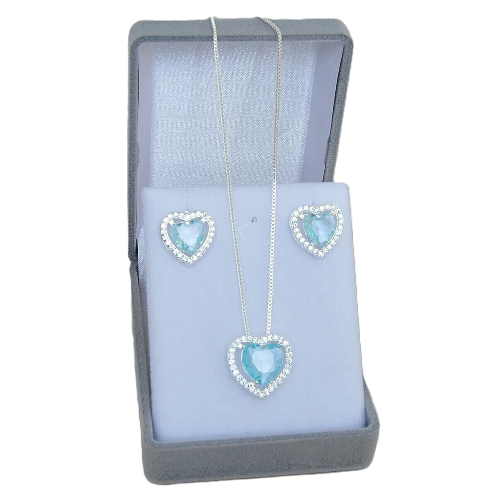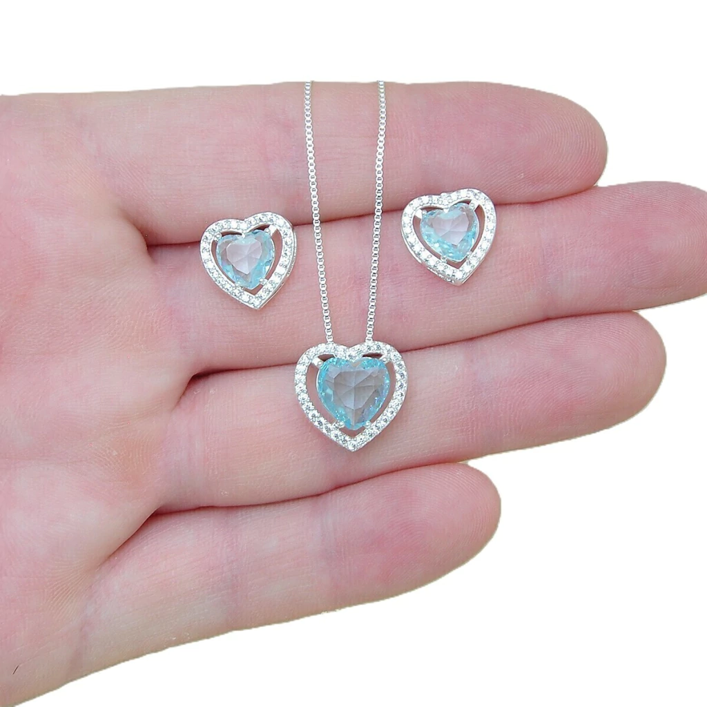 Conjunto Colar e Brinco Coração Azul Aqua Caixa Cravejada Banhado a Prata 925