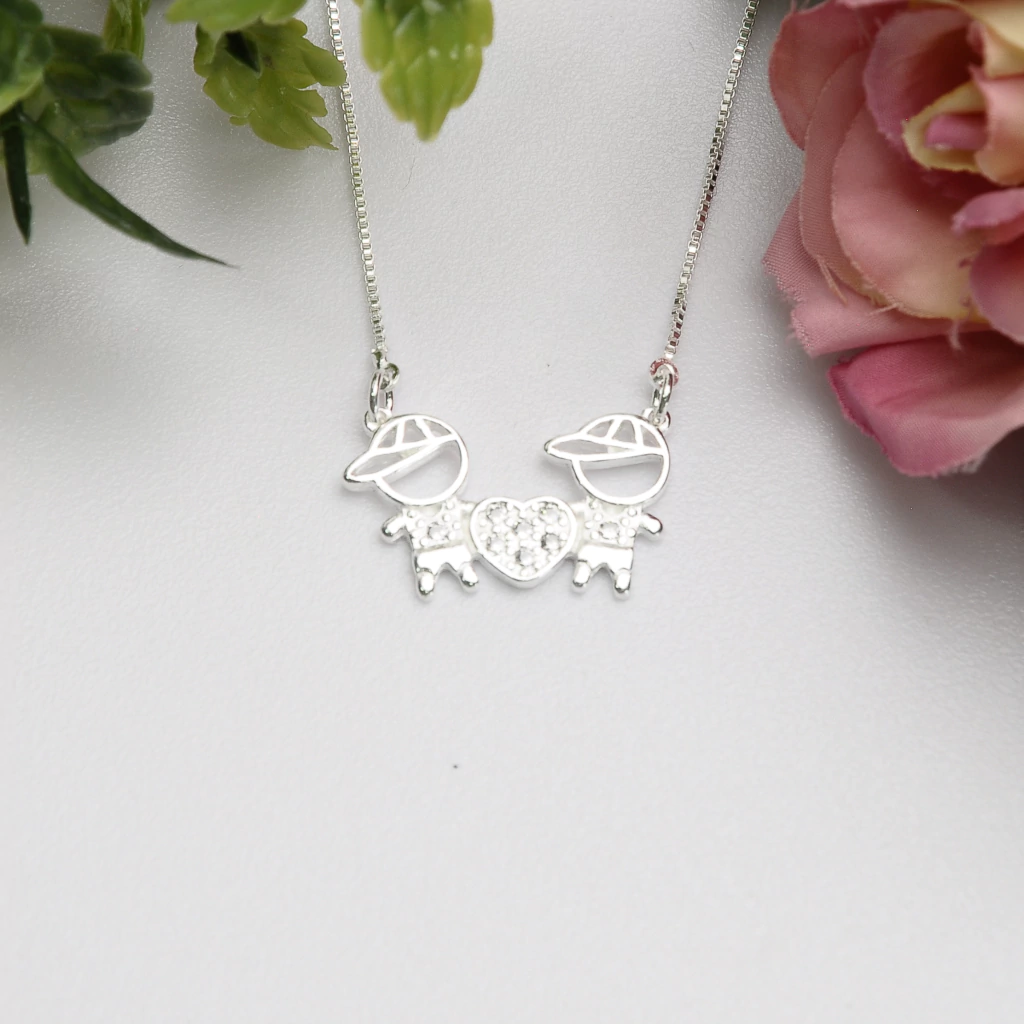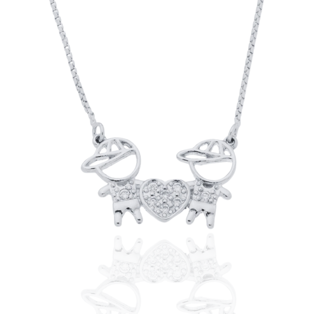 Colar Filhos Dois Meninos Coração Cravejado Banhado Prata 925