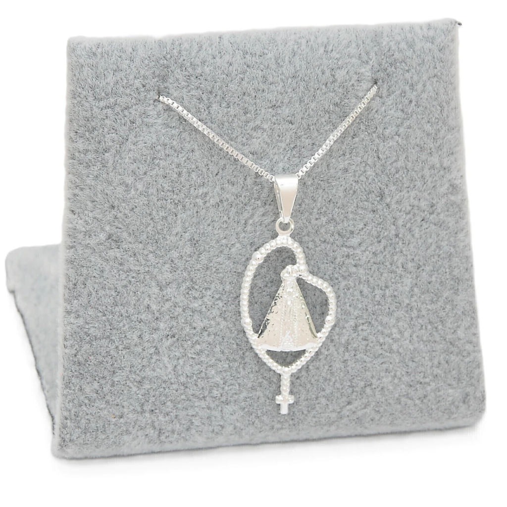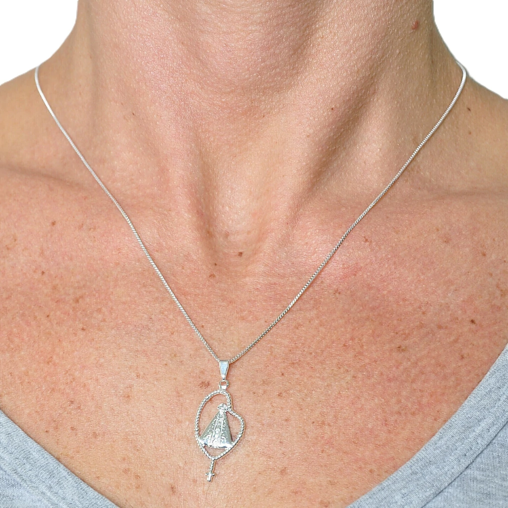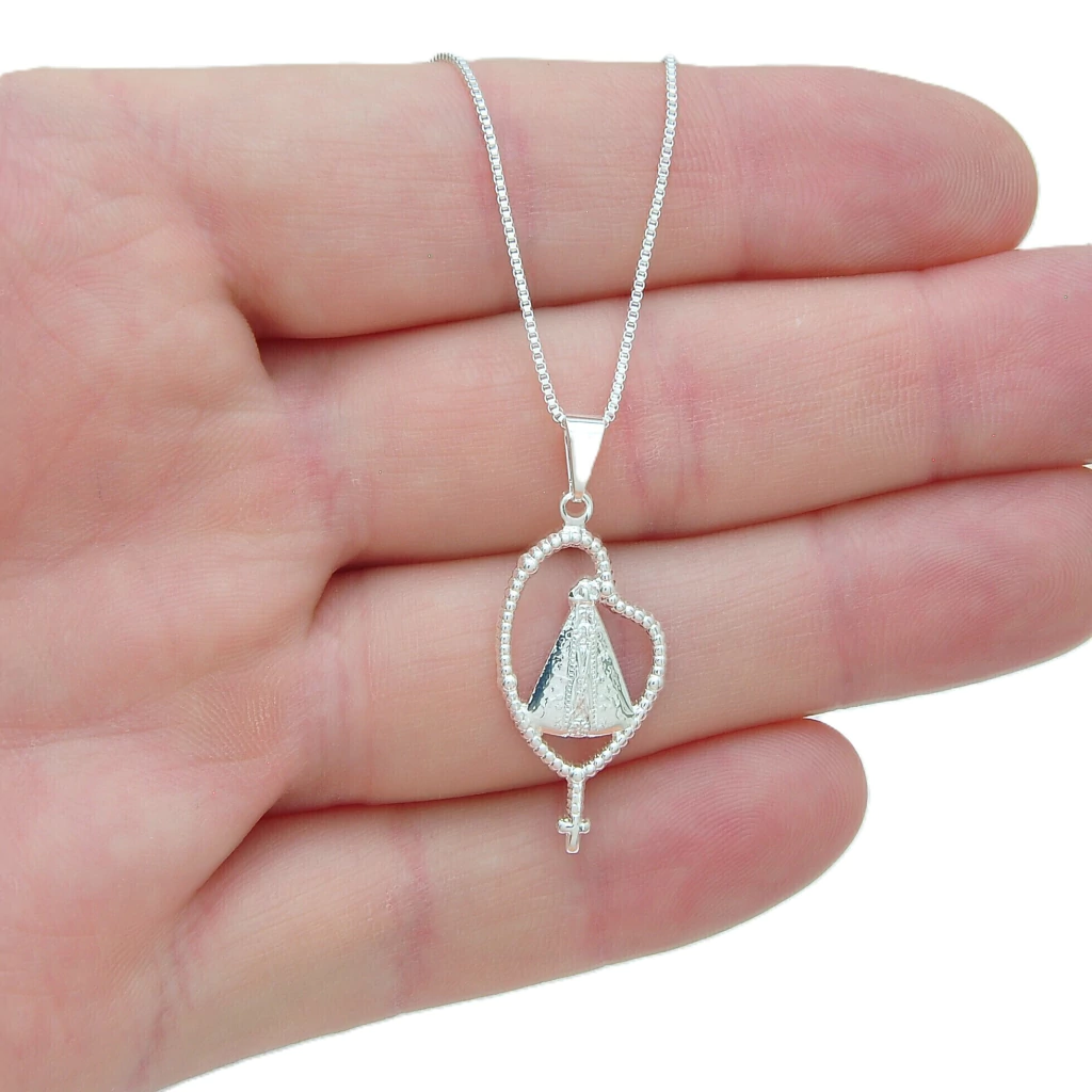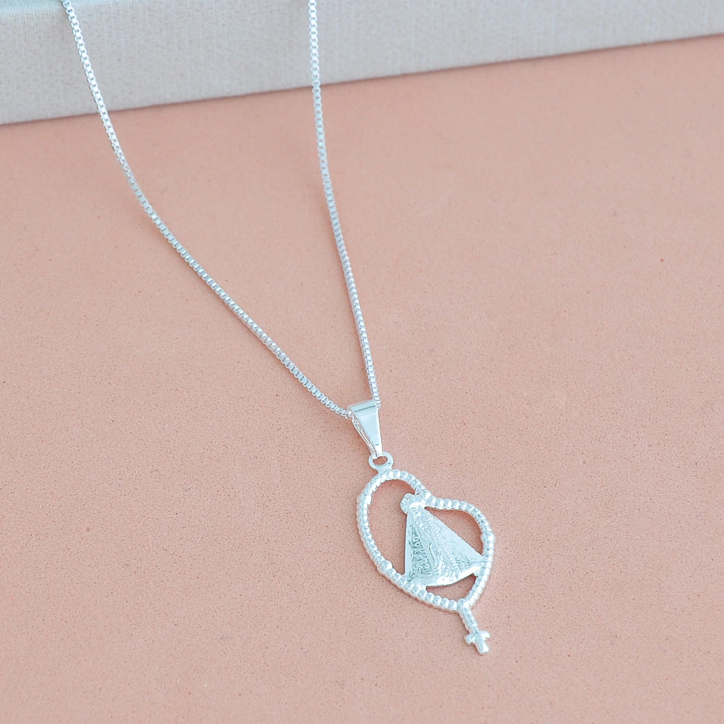 Colar Pingente Terço N.S. Aparecida Corrente Veneziana 45cm Banhado a Prata 925
