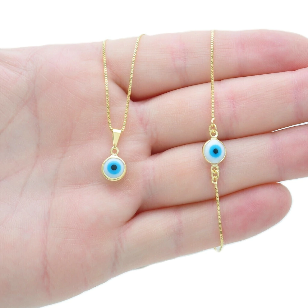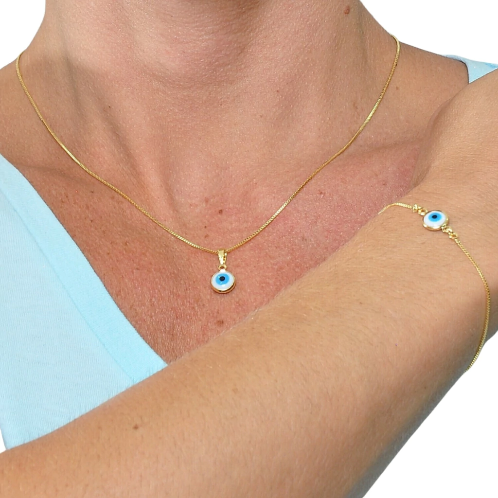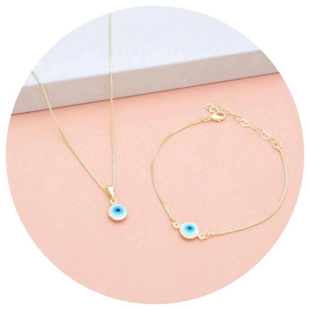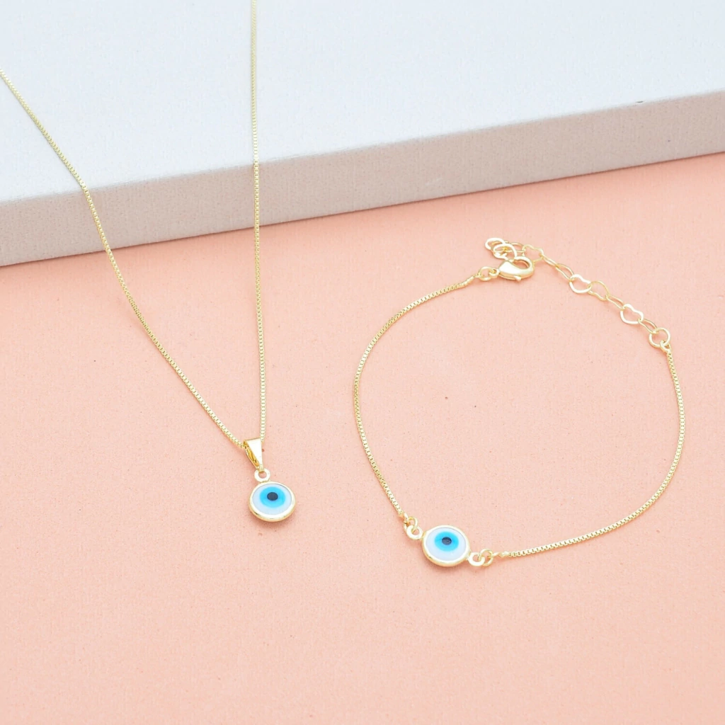 Conjunto Chocker 35cm e Pulseira Olho Grego Banhado a Ouro 18k