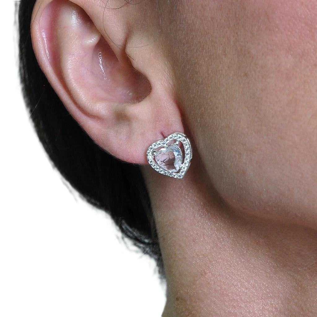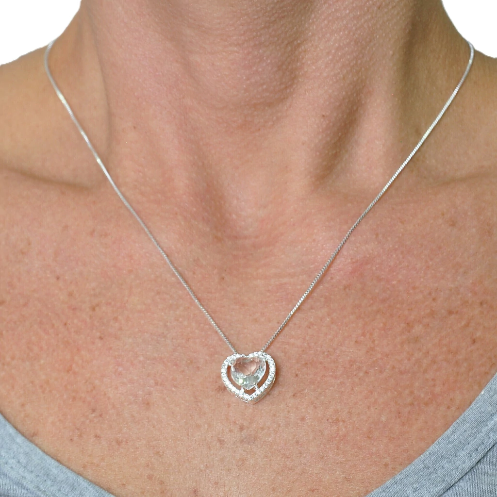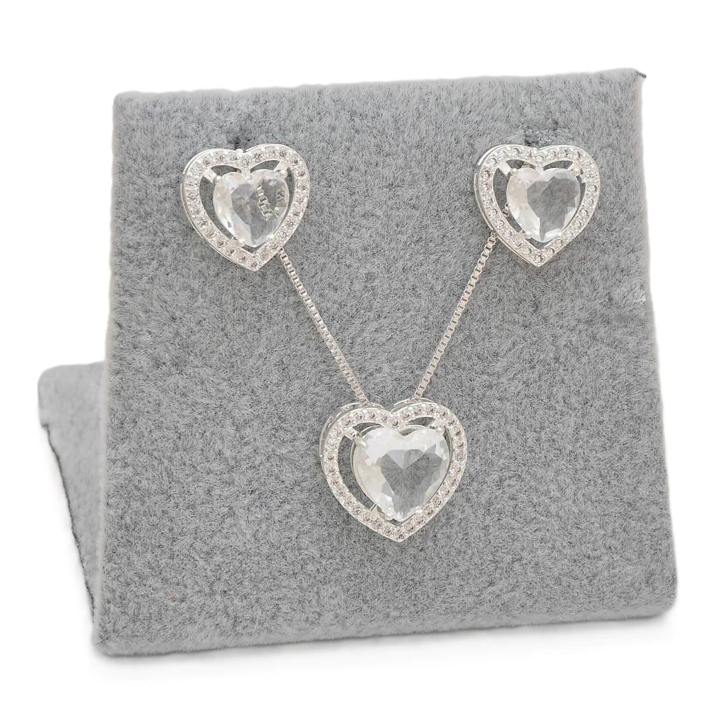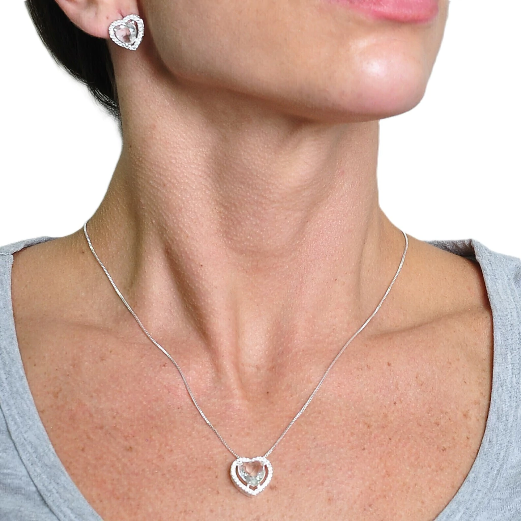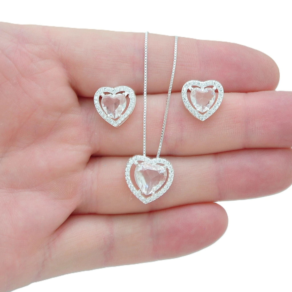 Conjunto Colar e Brinco Coração Branco Caixa Cravejada Banhado a Prata 925