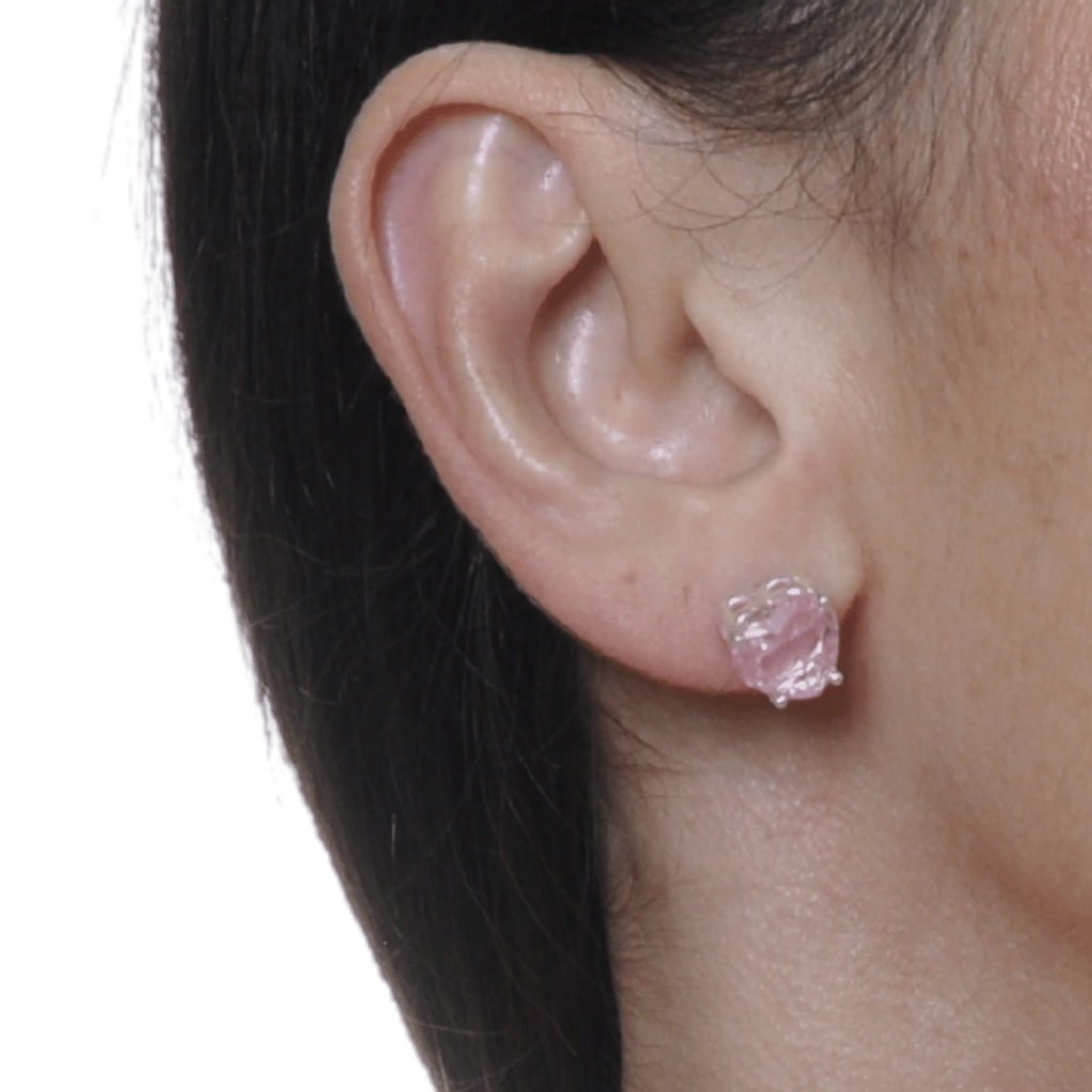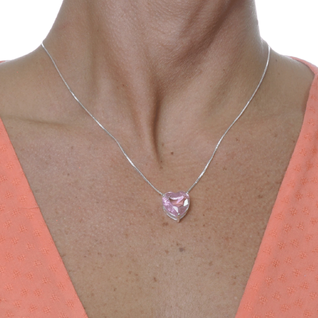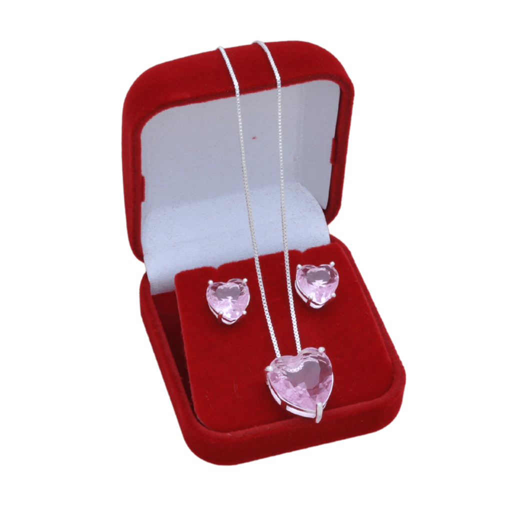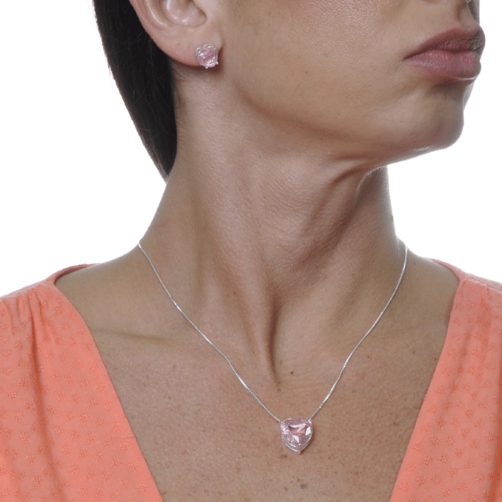 Conjunto Colar e Brinco Coração Cristal Rosa Banhado a Prata 925