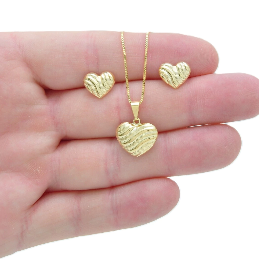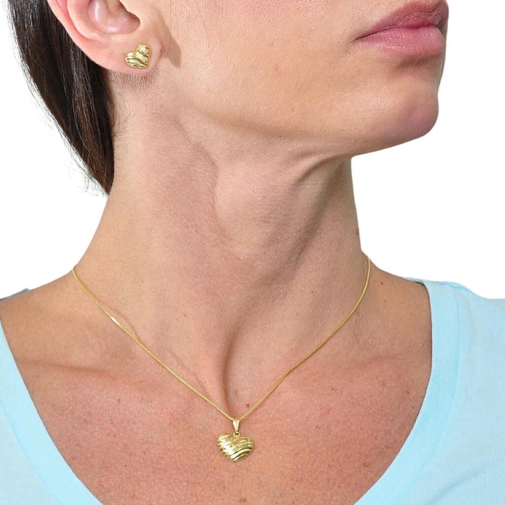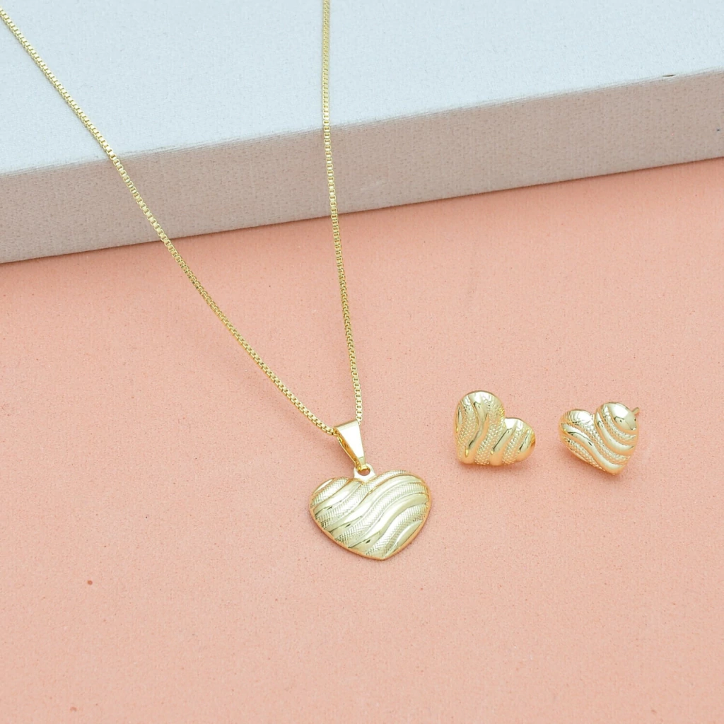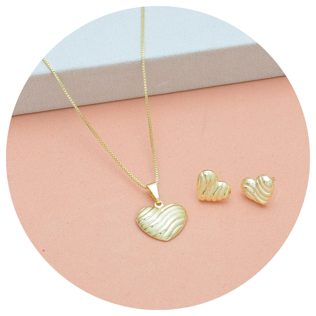 Conjunto Colar e Brinco Coração Frisado Banhado a Ouro 18k