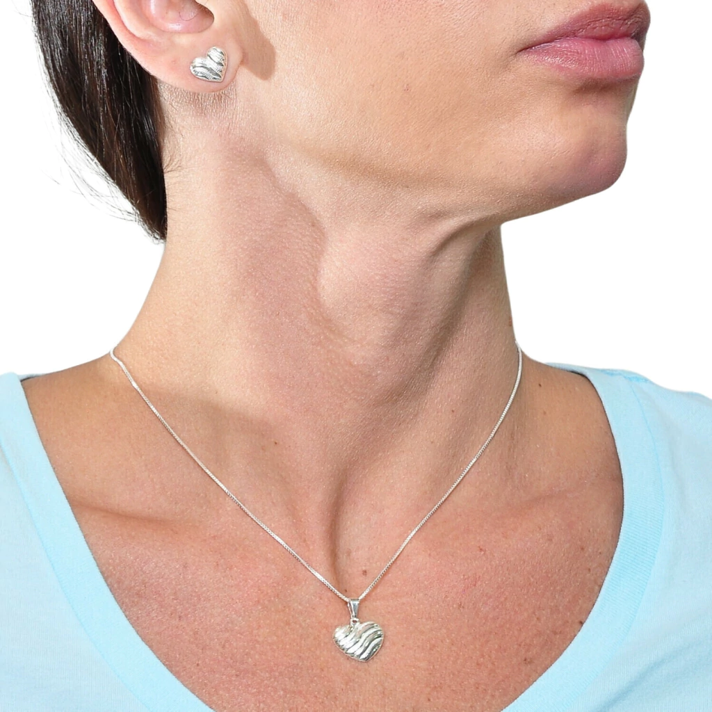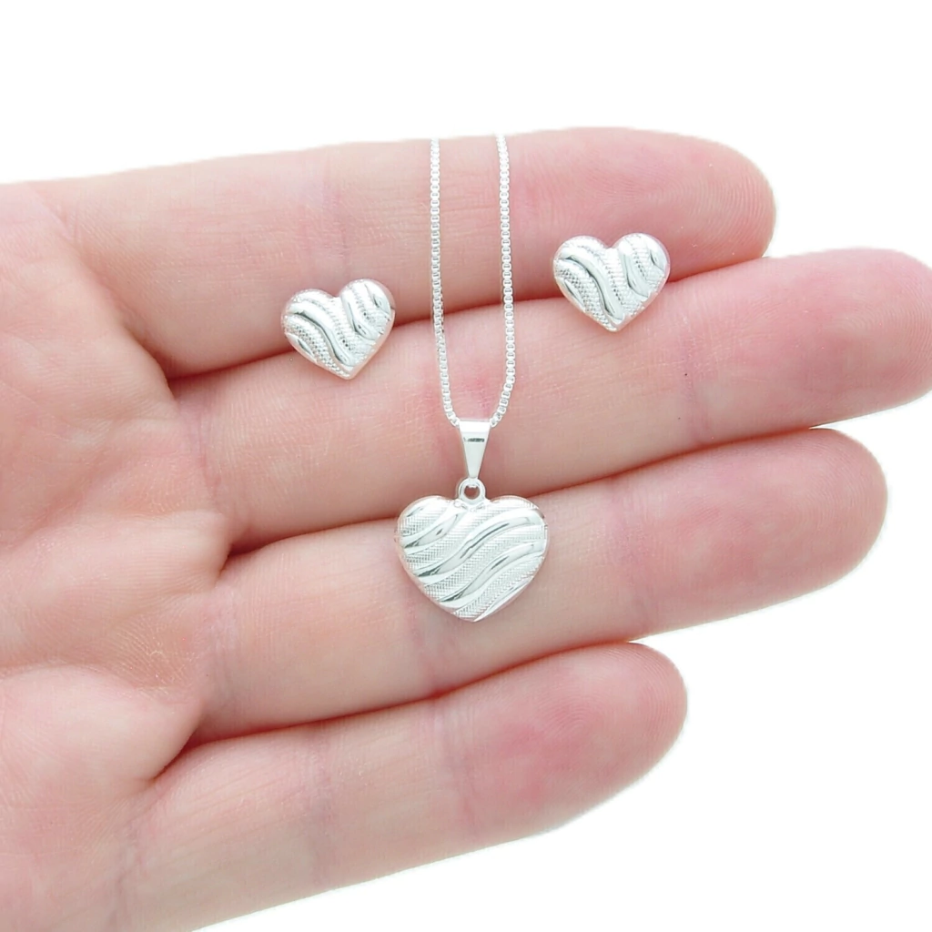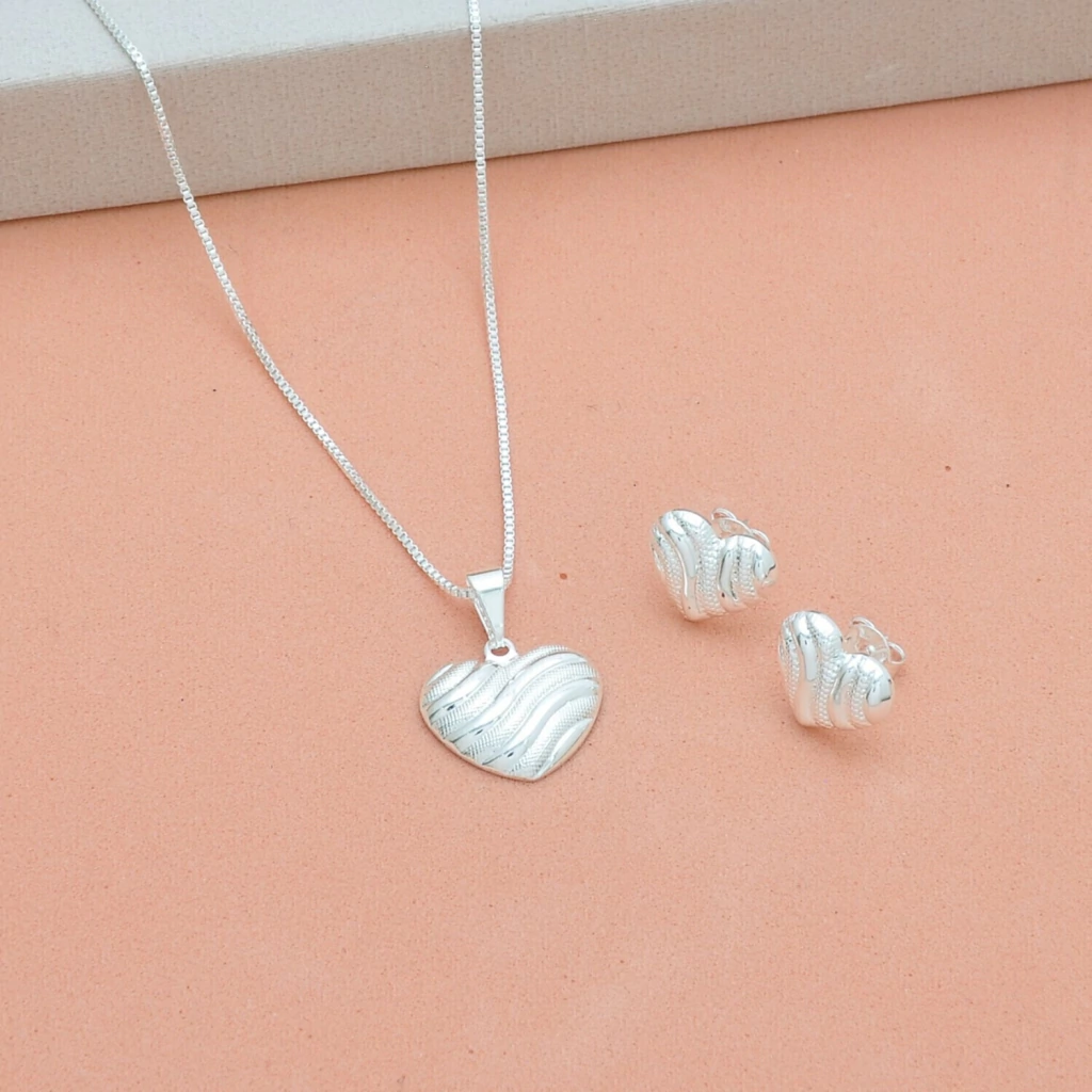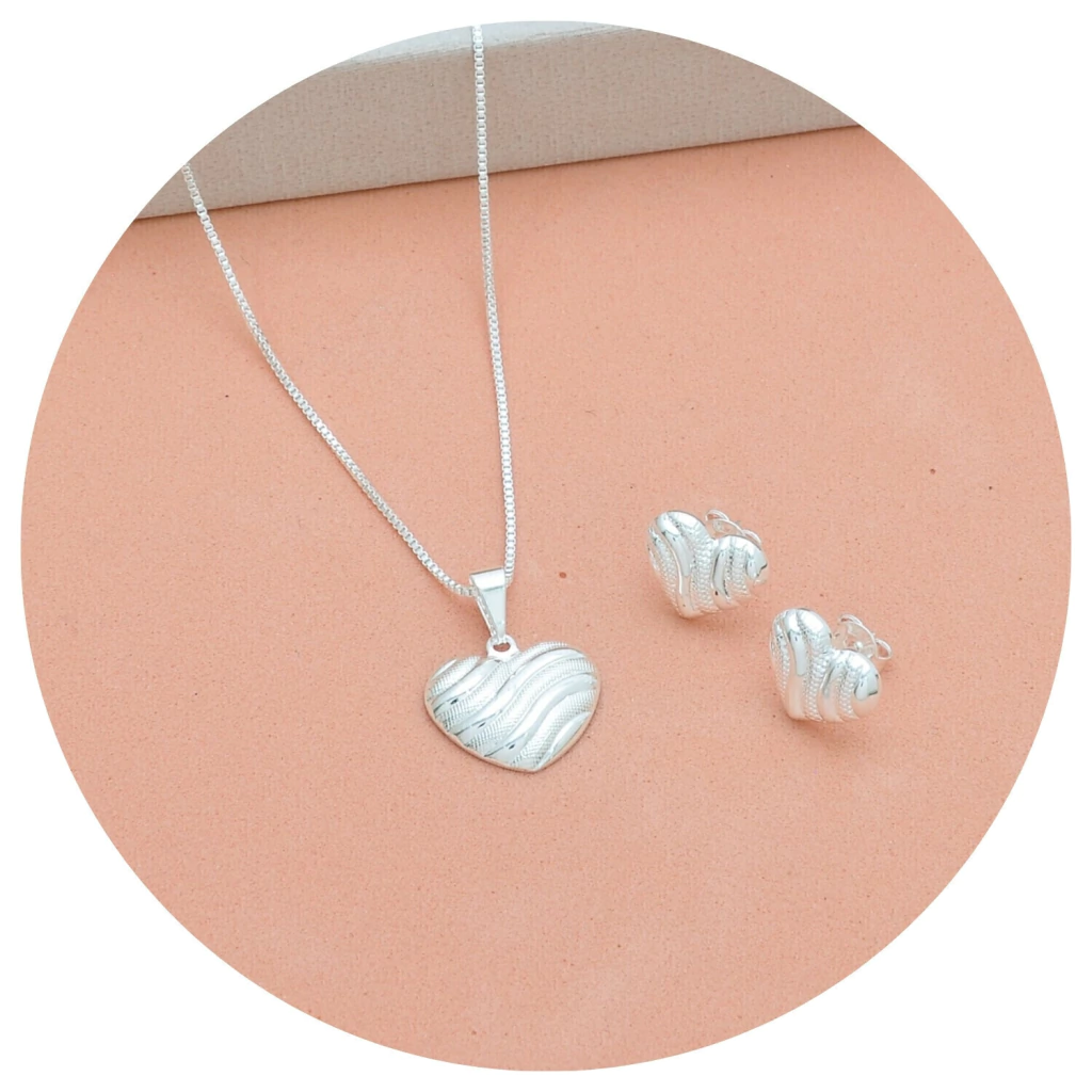 Conjunto Colar e Brinco Coração Frisado Banhado a Prata 925