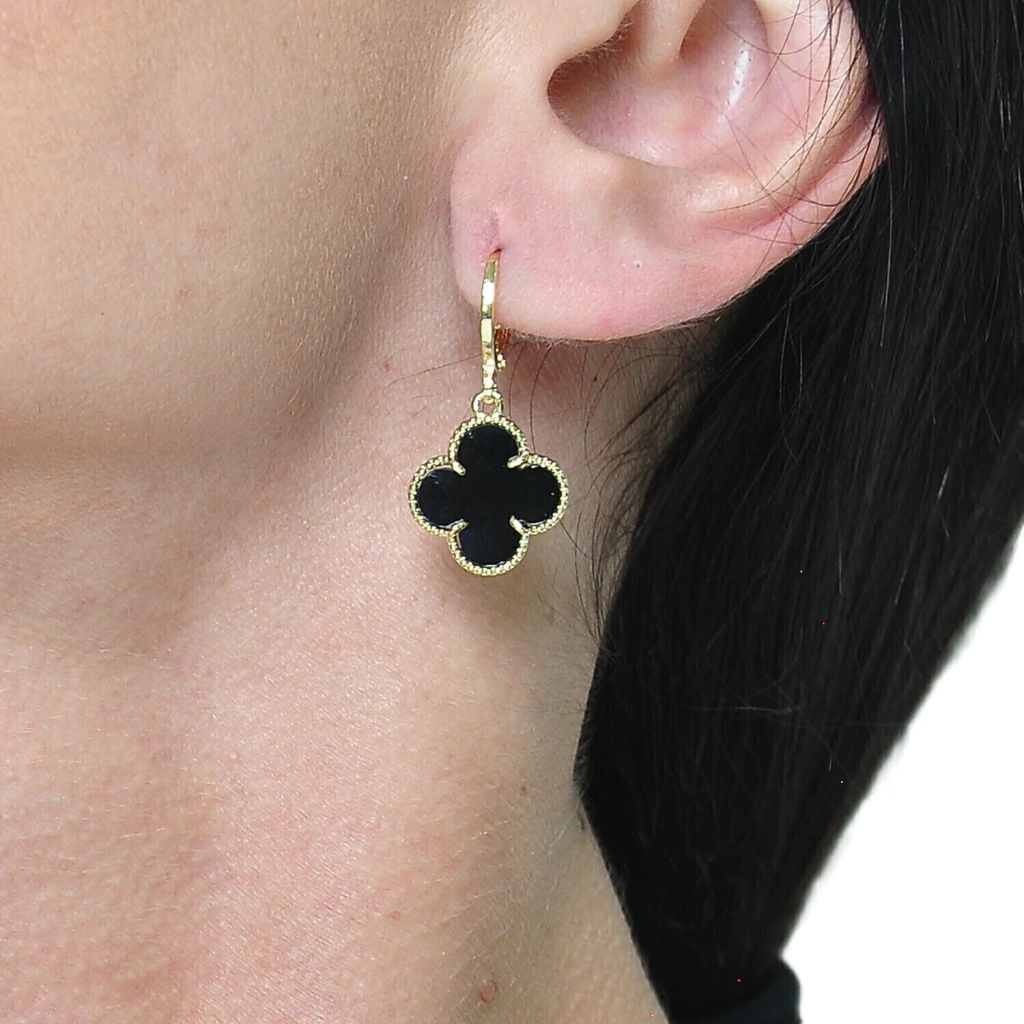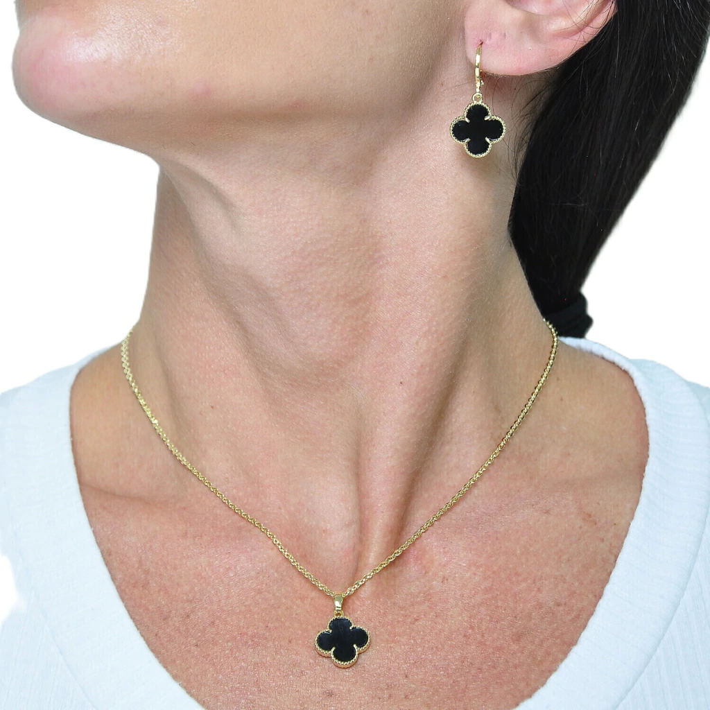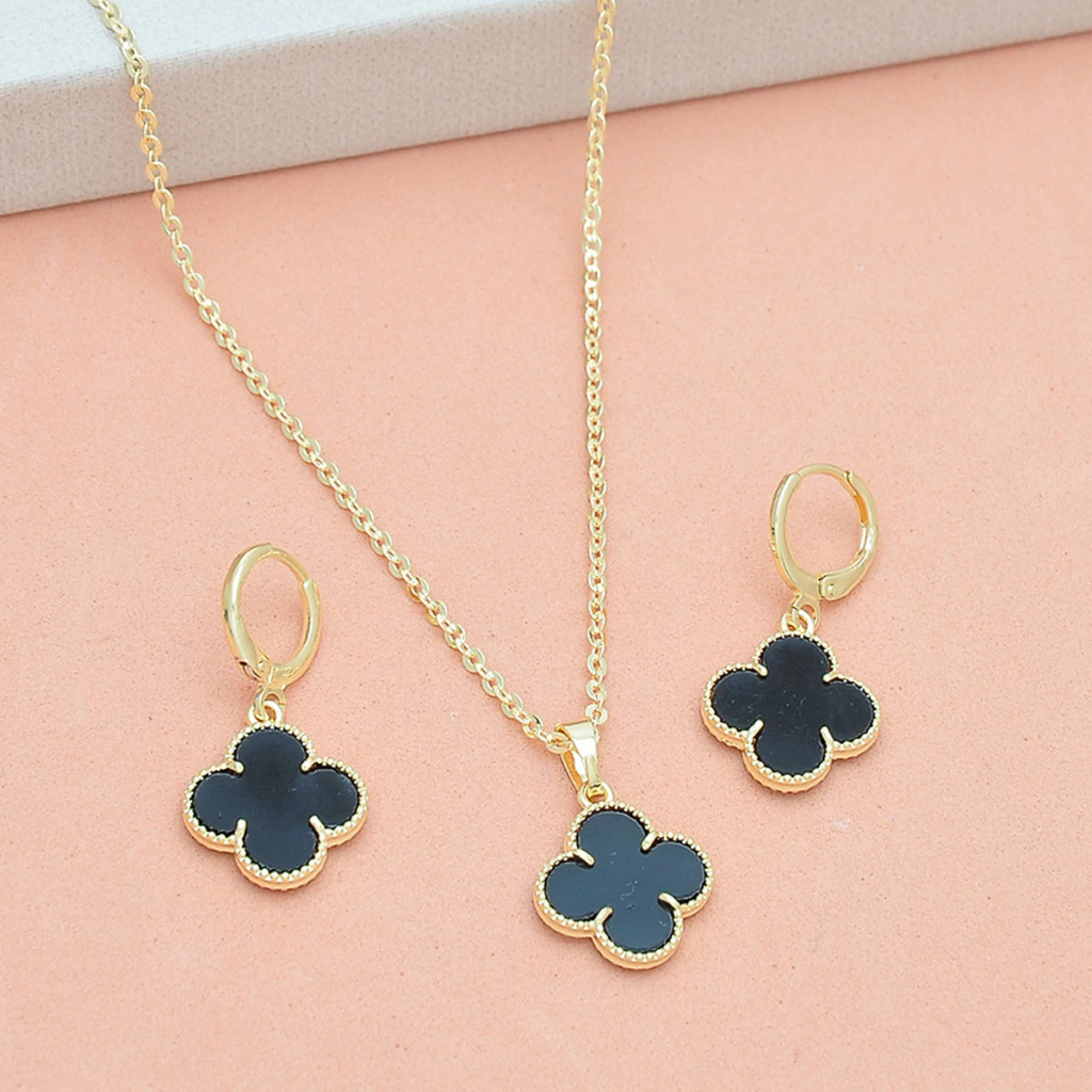 Conjuto Colar e Brinco Trevo Preto Banhado a Ouro 18k