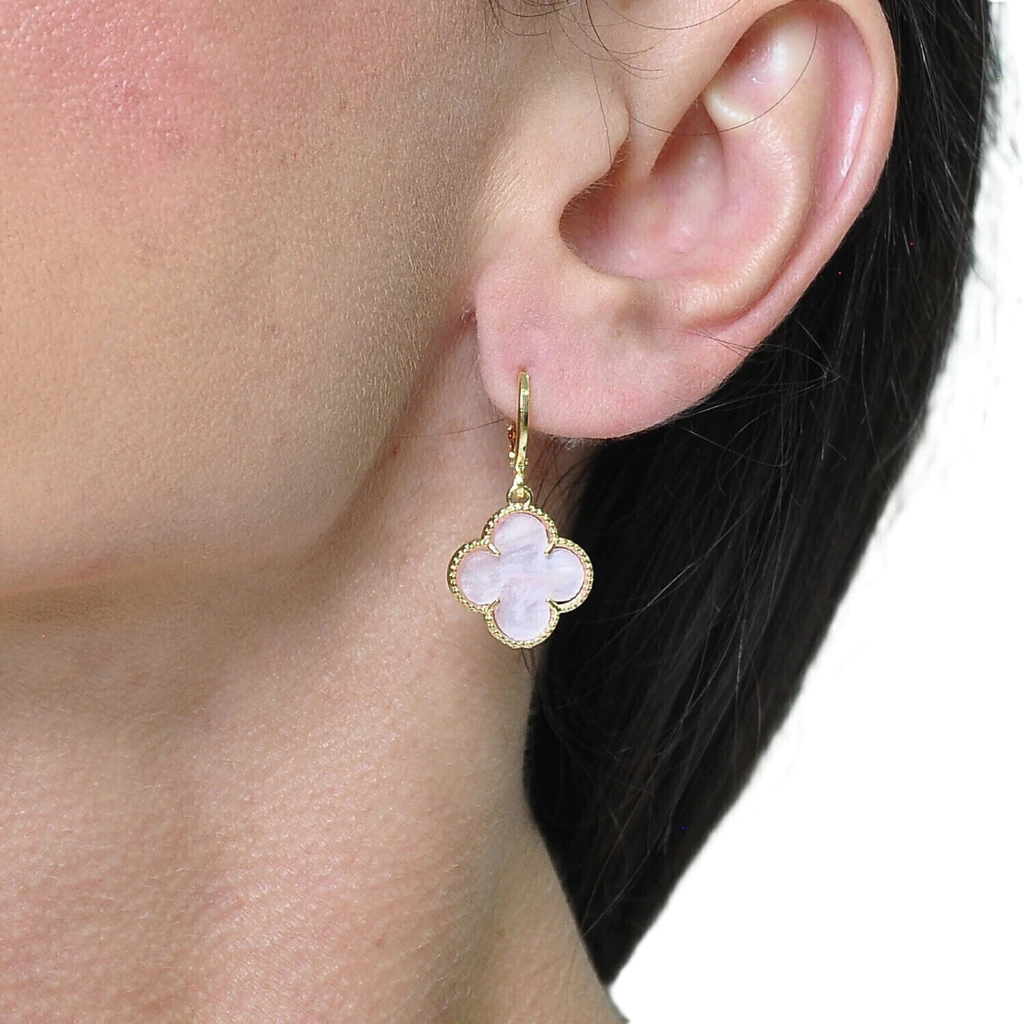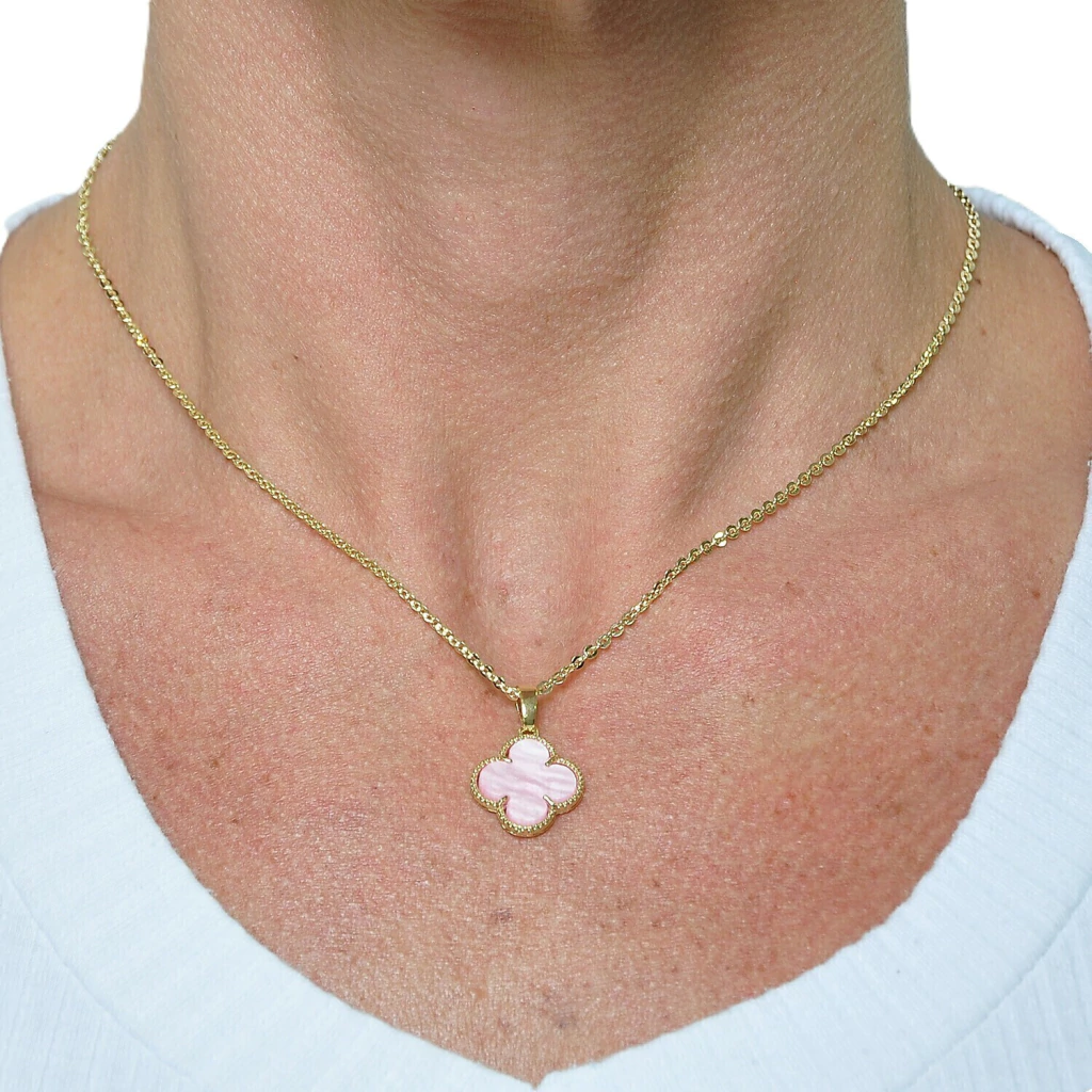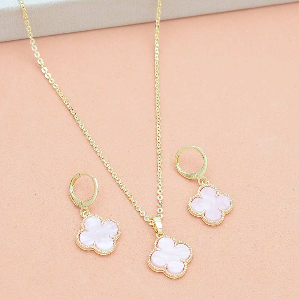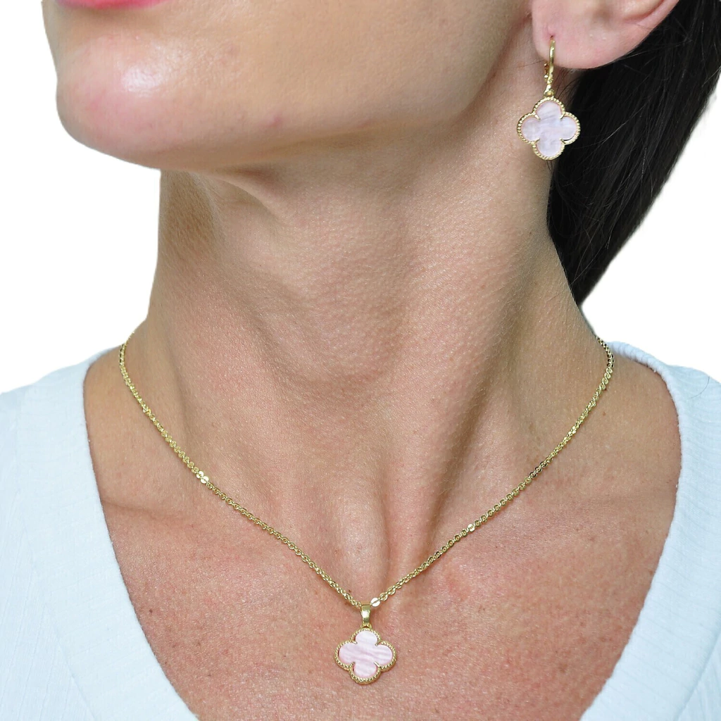 Conjuto Colar e Brinco Trevo Rosa Banhado a Ouro 18k