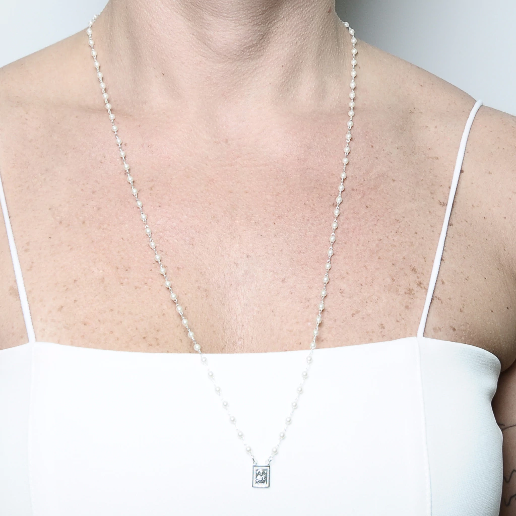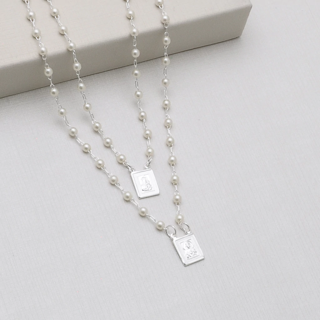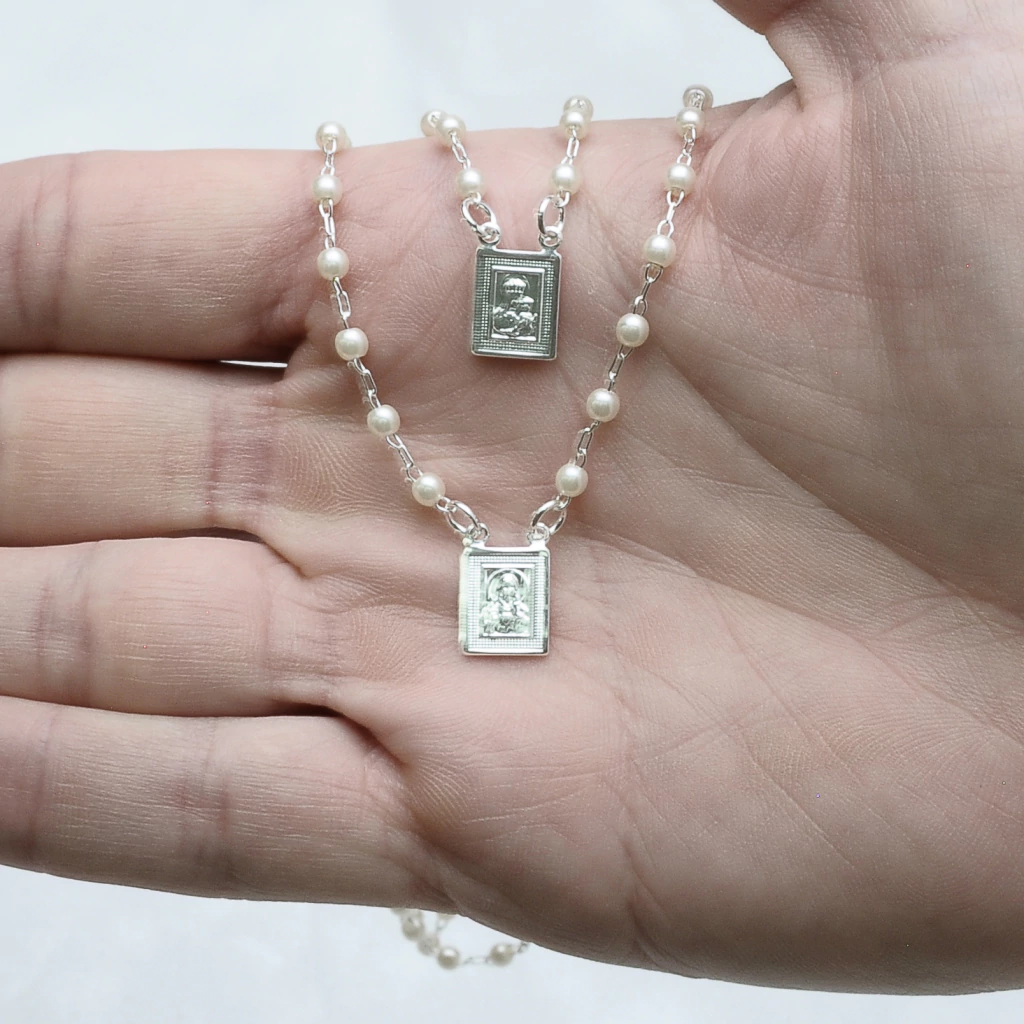 Escapulário Feminino Nossa Senhora Do Carmo Pérolas Banhado Em Prata 925