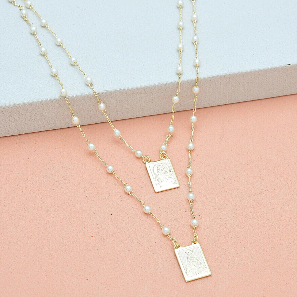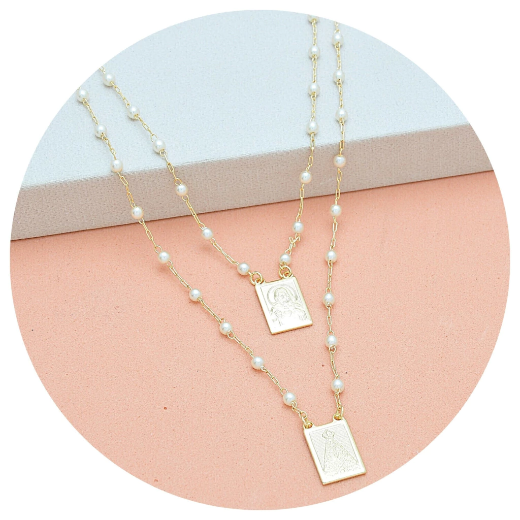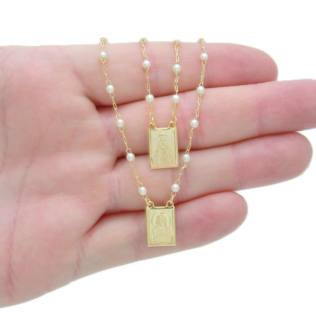 Escapulario Perolas Nossa S. Aparecida e Jesus Banhado a Ouro 18k