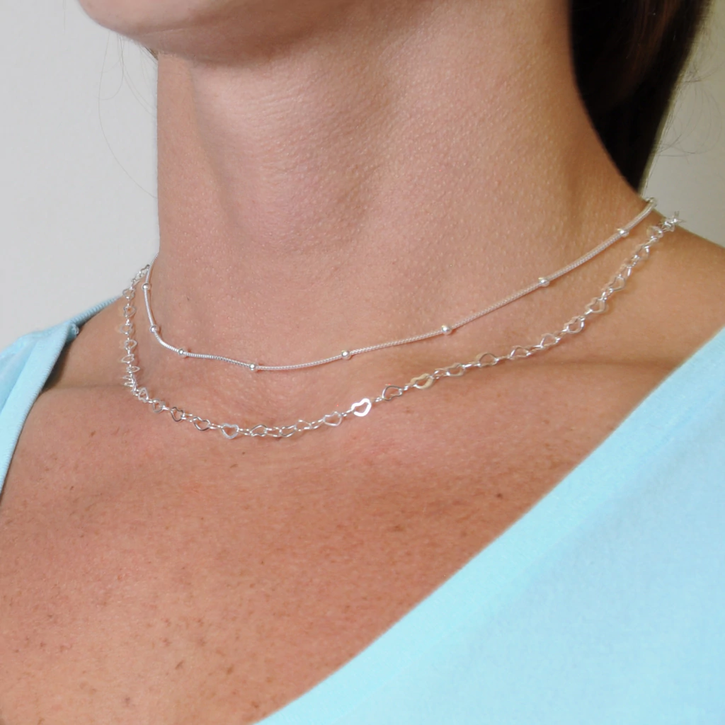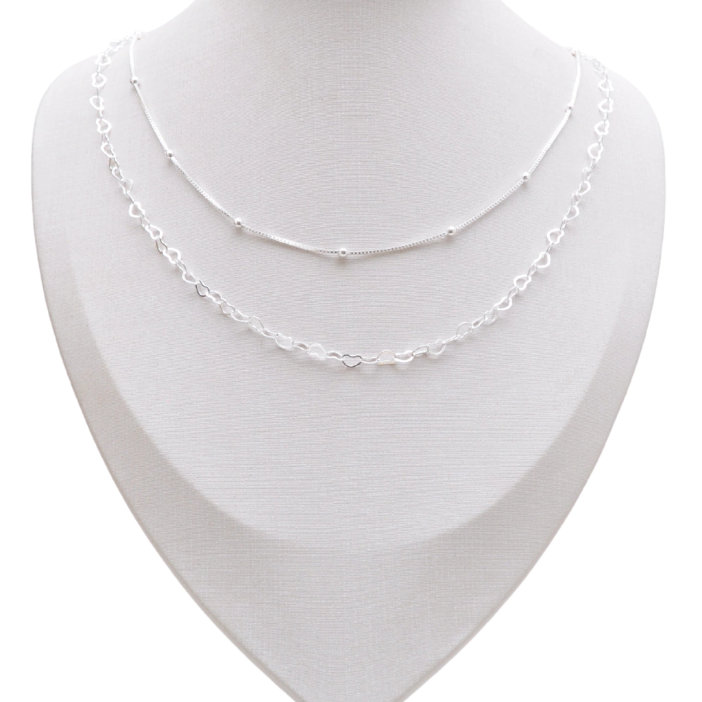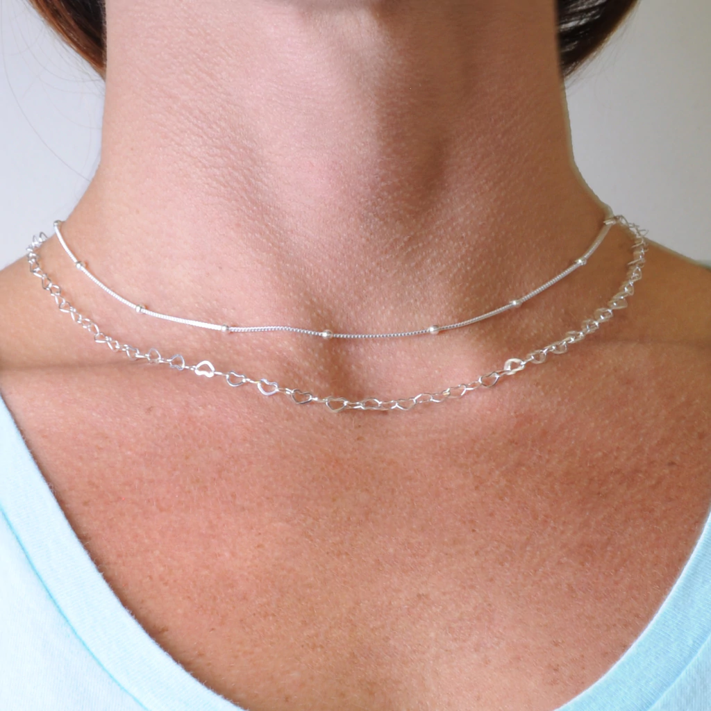 Kit 02 Colares Bolinha 40cm + Coração 45cm Banhado a Prata 925