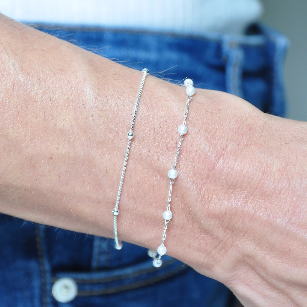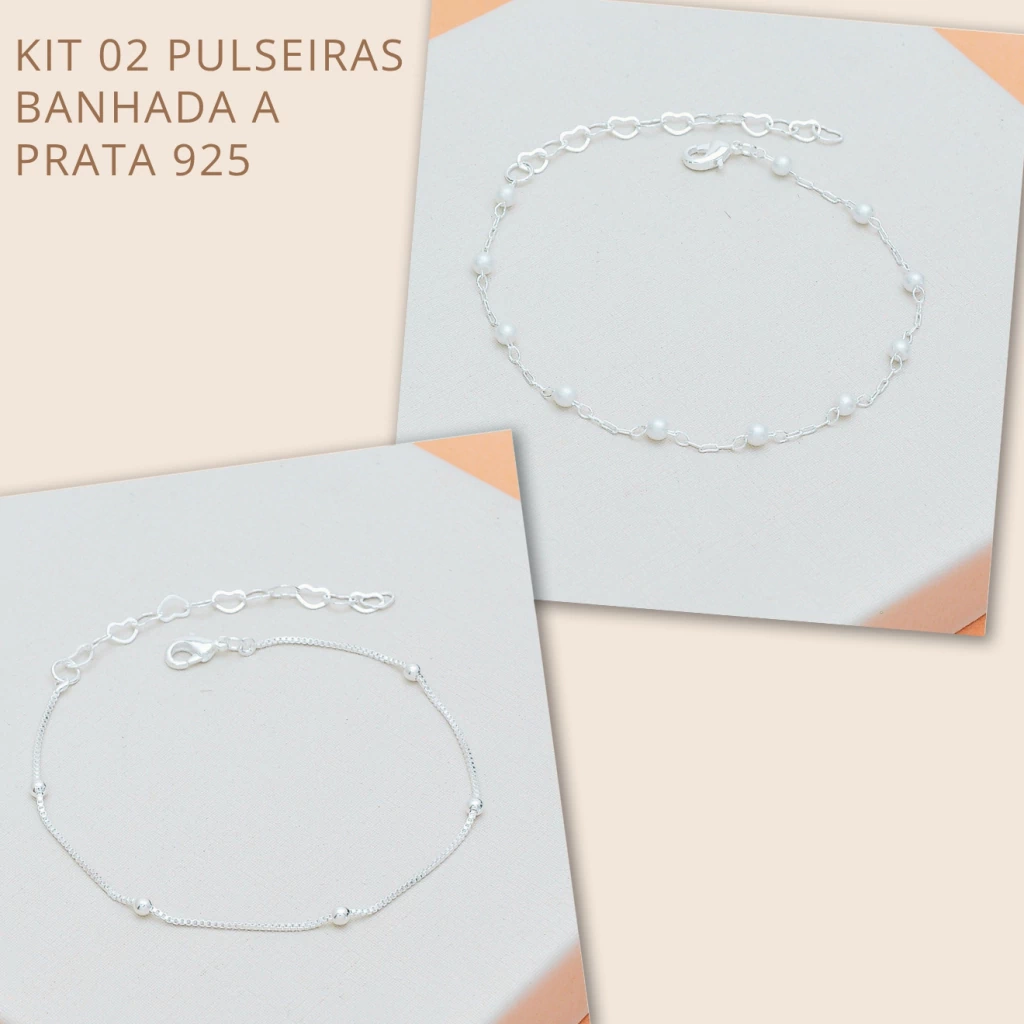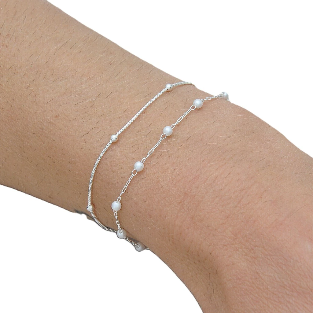Kit 02 Pulseiras Bolinha + Perola Banhado a Prata 925