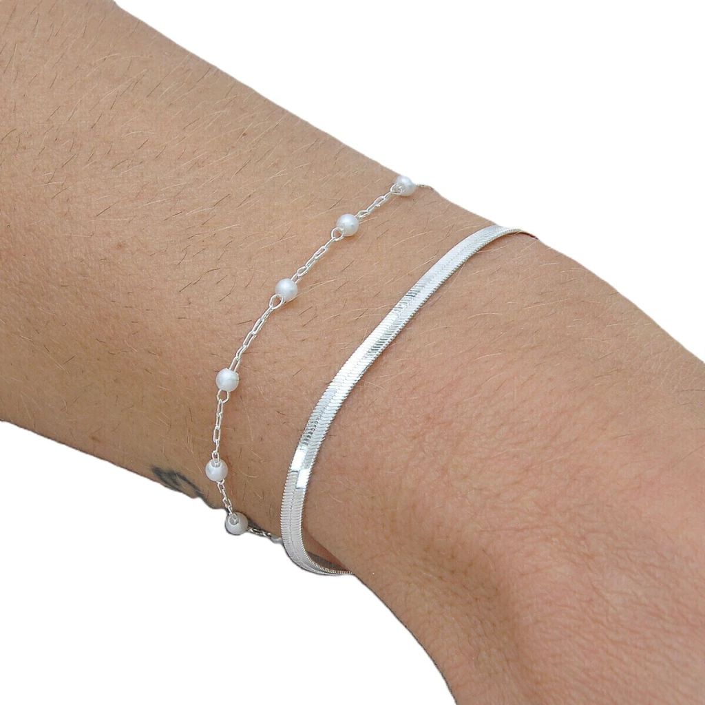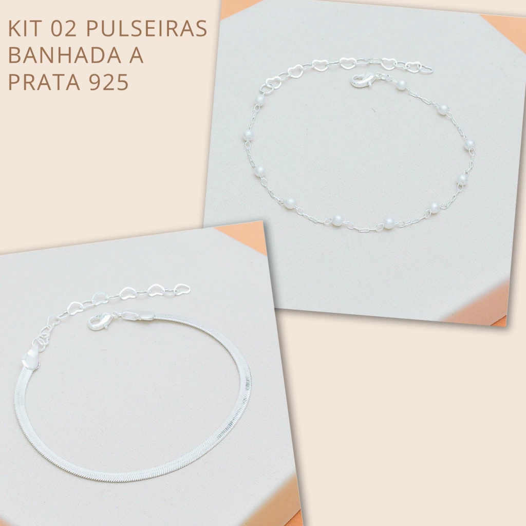 Kit 02 Pulseiras Fita + Perola Banhado a Prata 925
