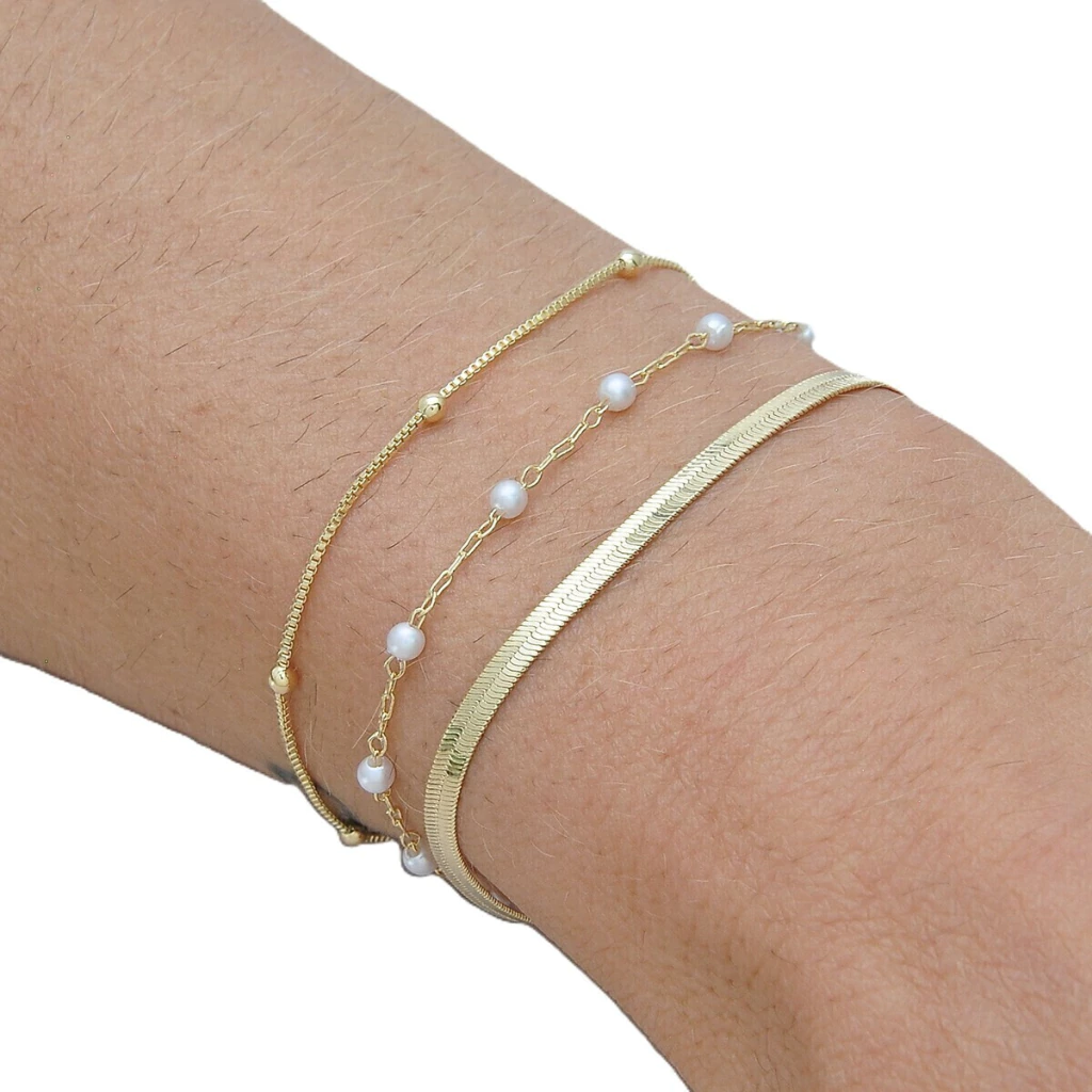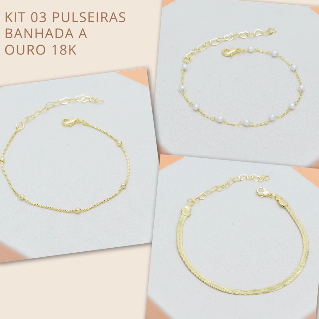Kit 03 Pulseiras Fita + Perola + Bolinha Banhado a Ouro 18k