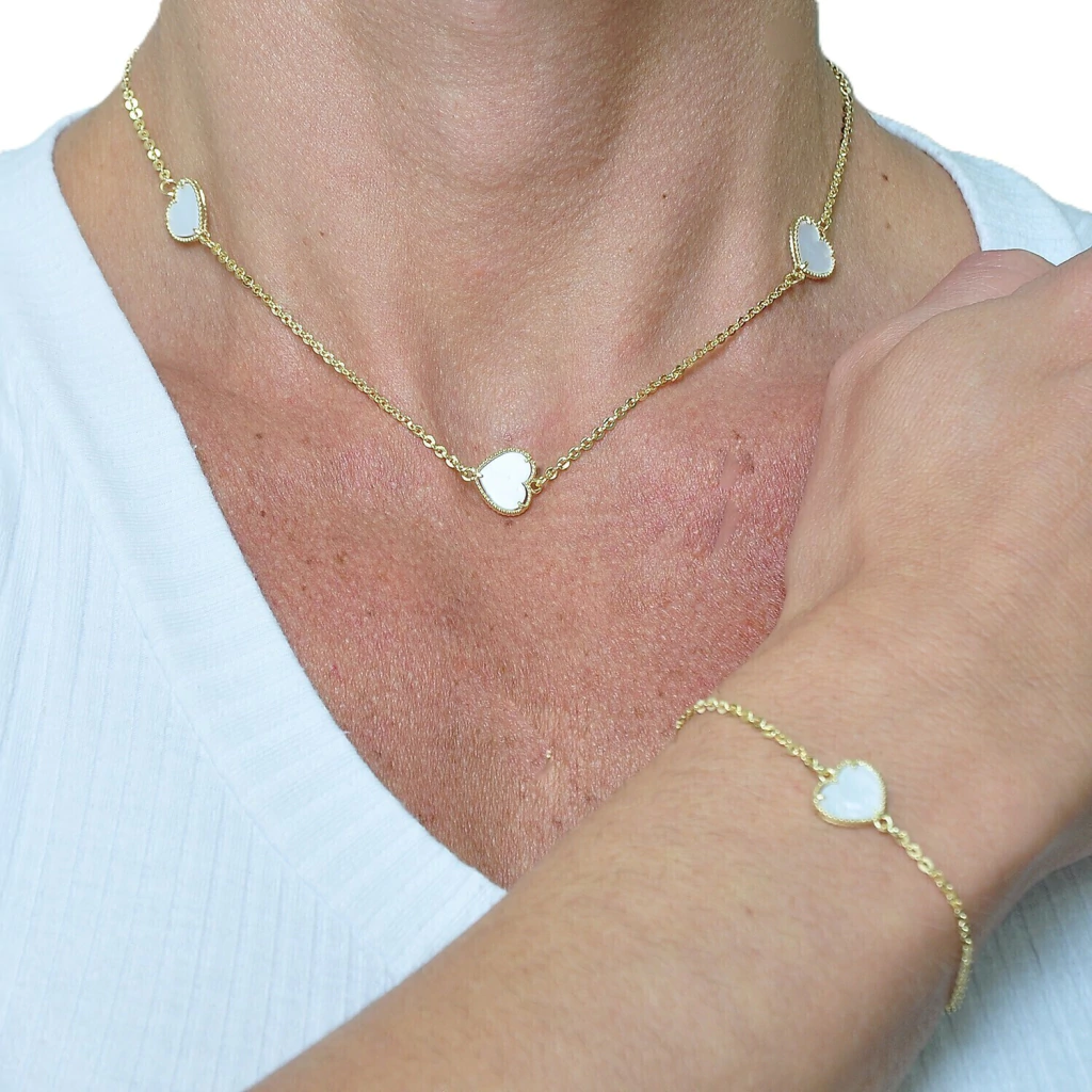 Kit Colar 03 Corações Branco e Pulseira Banhado a Ouro 18k