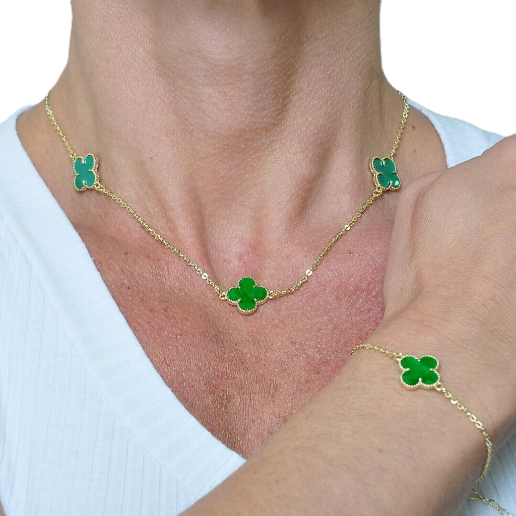 Kit Colar 03 Trevos Verde e Pulseira Banhado a Ouro 18k