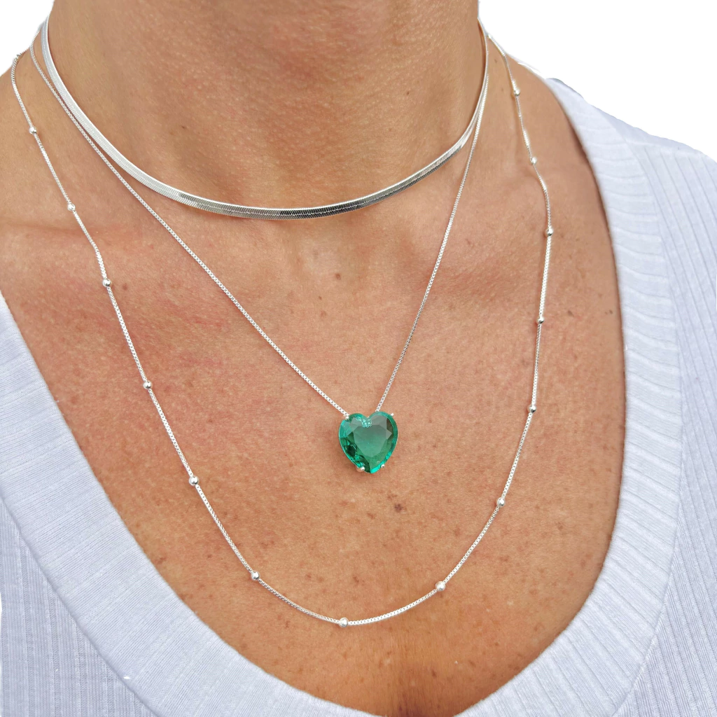 01 Conjunto Colar e Brinco Coração Verde, comprimento da corrente 45cm + 5cm Extensor