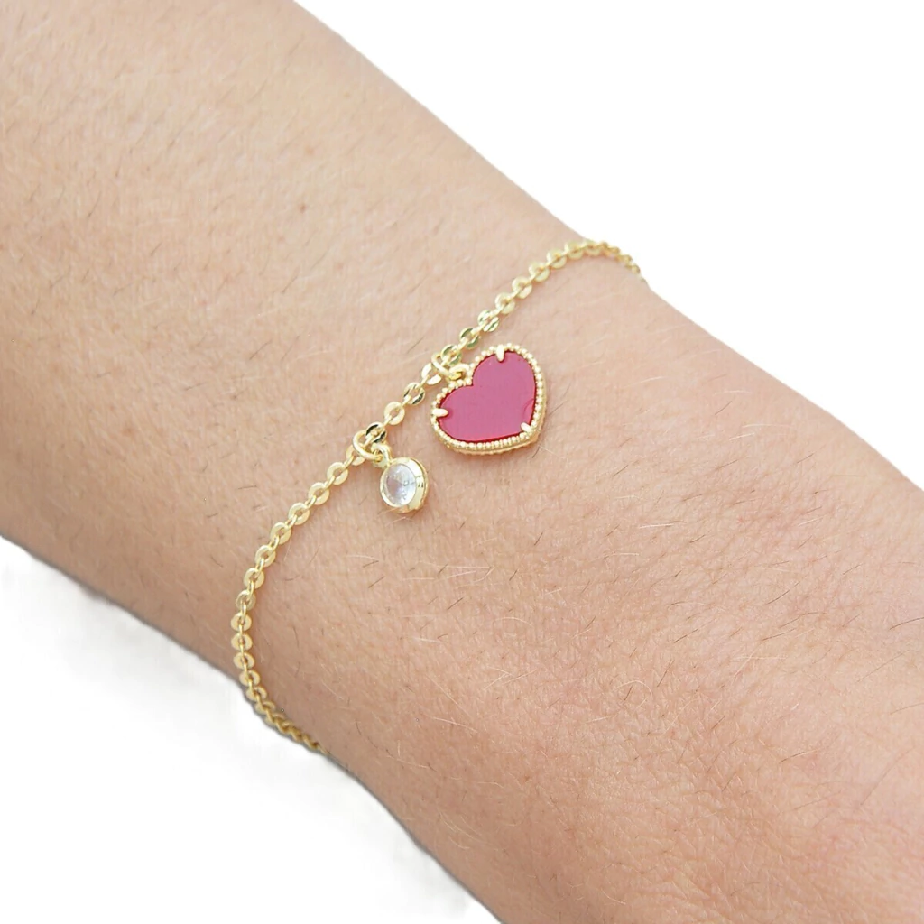 Pulseira 01 Coração Vermelho e Ponto de Luz Banhado a a Ouro 18k
